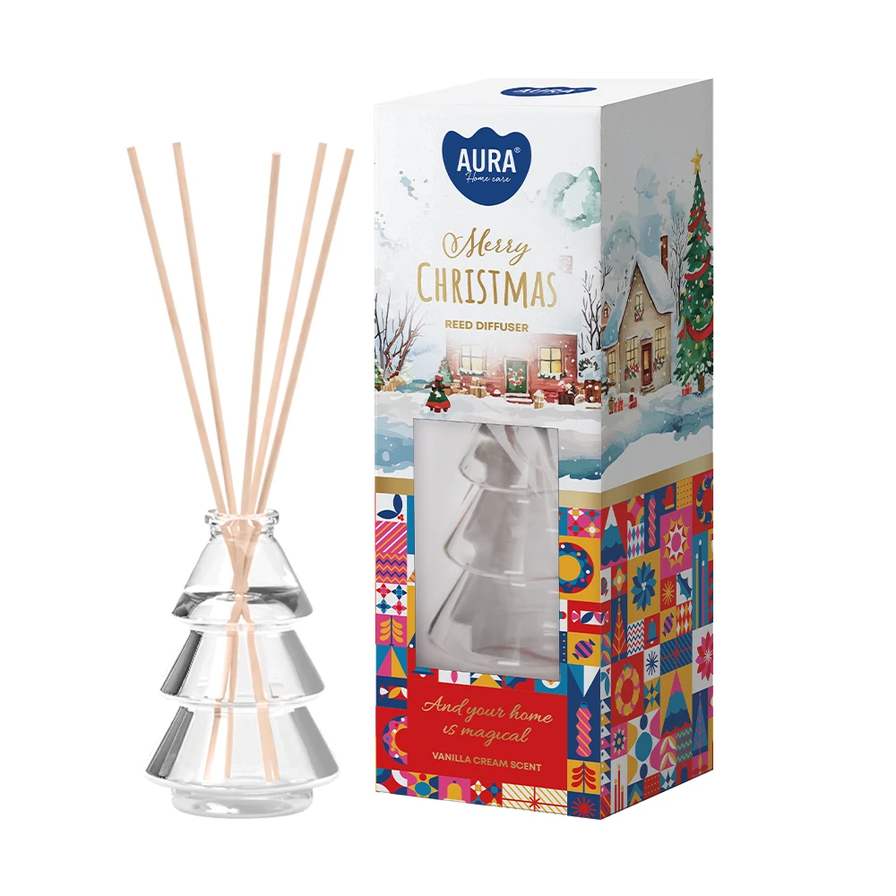 Świąteczny dyfuzor zapachowy Aura Merry Christmas wprowadza do wnętrza ciepłą, magiczną aurę Bożego Narodzenia. Elegancki dyfuzor w kształcie choinki z minimalistycznym designem stopniowo uwalnia aromat, tworząc przytulny klimat w salonie, biurze czy przedpokoju. Jego kompozycja opiera się na kremowej, otulającej wanilii obecnej w nutach głowy i serca, która przywołuje zapach świątecznych wypieków. W bazie wyczuwalne są bób tonka, delikatny heliotrop oraz żywiczna nuta dodająca zimowego charakteru. To harmonijne połączenie sprawia, że wnętrze staje się cieplejsze i bardziej magiczne. Dyfuzor Merry Christmas to idealny prezent dla bliskich oraz stylowy dodatek do sezonowej aranżacji, który wprowadza świąteczny nastrój na cały zimowy sezon.