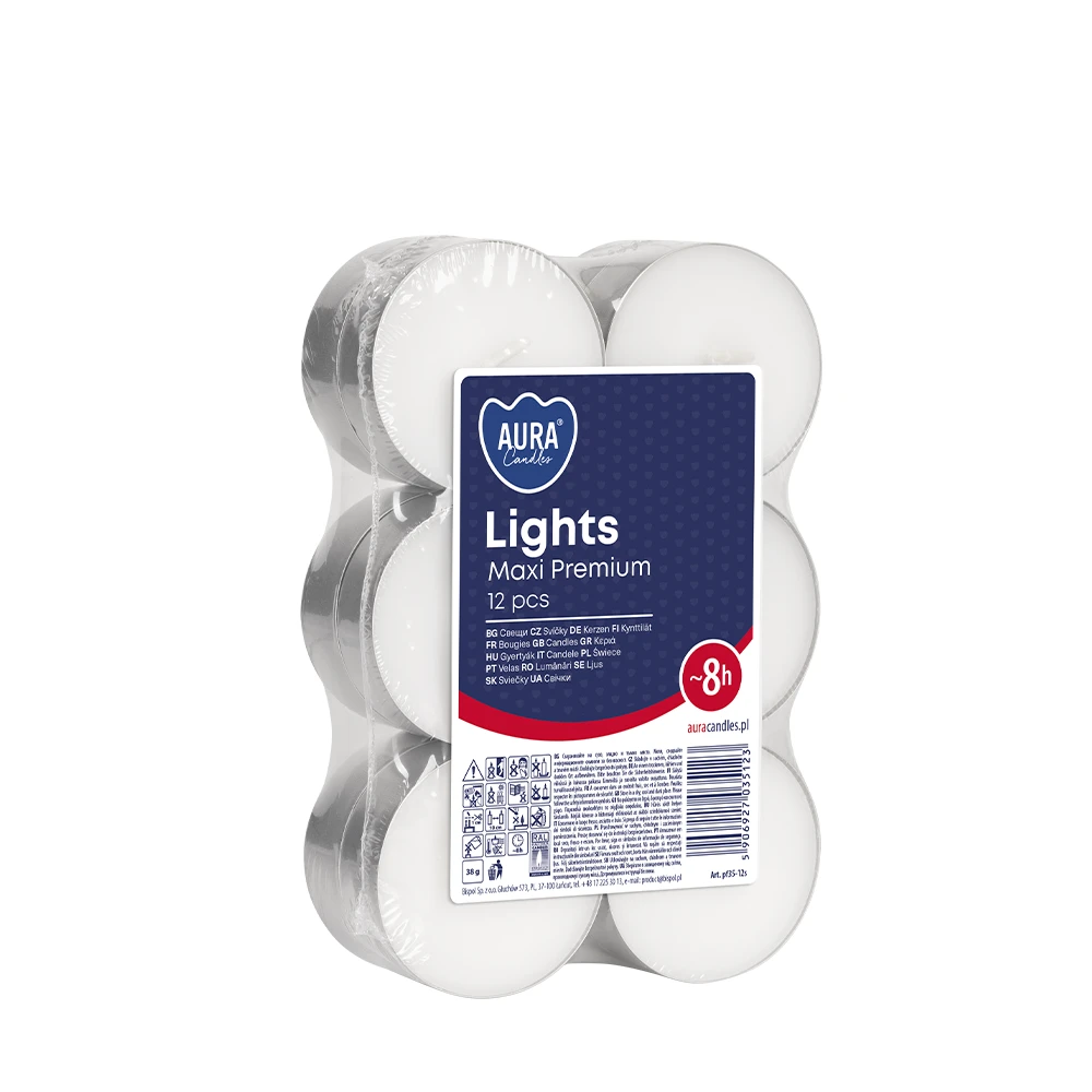 Duże świeczki MAXI LIGHTS PREMIUM to bezzapachowe podgrzewacze o średnicy 5,7 cm i wysokości 2,2 cm, zapewniające aż do 8 godzin ciepłego, nastrojowego światła. W opakowaniu znajdziesz 12 sztuk, idealnych do dekoracji wnętrz, stołów czy przestrzeni w restauracjach, hotelach i spa. Bezdymne, czyste i łatwe w użytkowaniu, dodadzą elegancji i przytulności każdemu miejscu, tworząc wyjątkową atmosferę na każdą okazję.