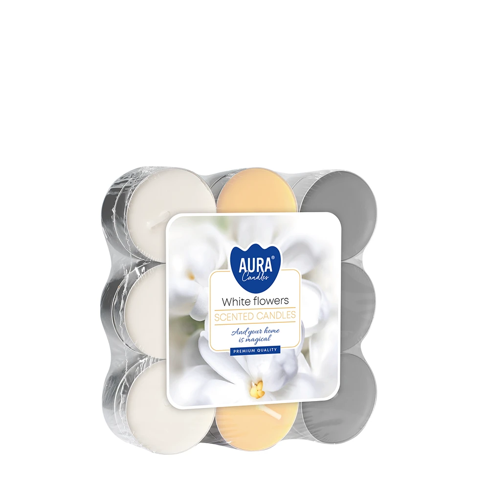 Stwórz elegancki, kwiatowy klimat w swoim domu dzięki świeczkom zapachowym Białe kwiaty. Zestaw 18 podgrzewaczy o subtelnych nutach zielonej trawy, konwalii, róży i jaśminu pozwala na długotrwałe wprowadzenie świeżości i delikatności. Czas palenia do 4 godzin umożliwia tworzenie relaksującej atmosfery w sypialni, salonie czy łazience. Zapal jedną lub kilka, aby podkreślić elegancję i romantyczny nastrój każdej chwili relaksu, ciesząc się kojącym aromatem białych kwiatów.