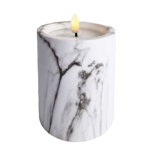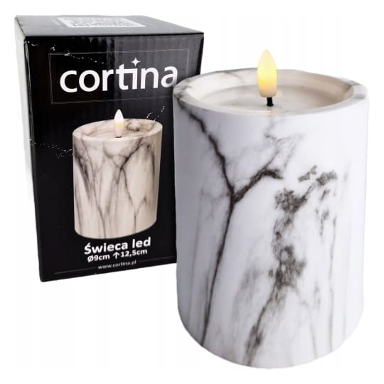 Elegancka świeca LED marki Cortina z efektem marmuru w kolorze szarym. Idealna jako dekoracja, wkład do lampionów, stroików lub alternatywa dla tradycyjnych świec parafinowych.