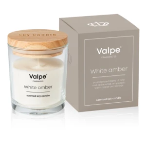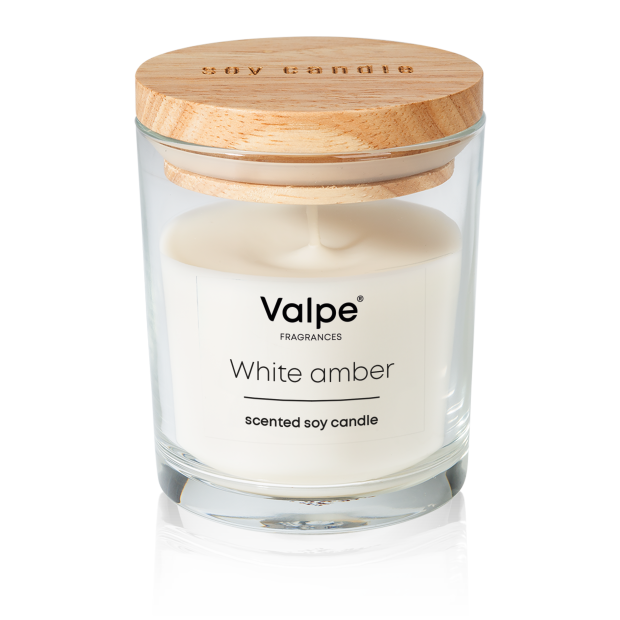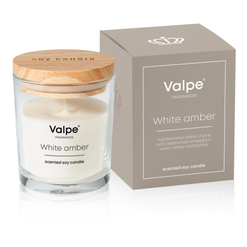 Sojowa świeca zapachowa Valpe Biały bursztyn to luksusowy produkt premium, który łączy elegancję z naturalnym aromatem. Wykonana z niemodyfikowanej soi, pali się czysto i równomiernie do 35 godzin. Szklany słoik z drewnianą pokrywką nie tylko zabezpiecza świecę przed kurzem, ale także wprowadza stylowy akcent do wnętrza. Kompozycja łączy nuty sosny, cedru i skóry z ciepłym bursztynem, cyklamenem i pigwą, tworząc aromat sprzyjający relaksowi i przytulnej atmosferze. Idealna do sypialni, salonu, biura i jako elegancki prezent.