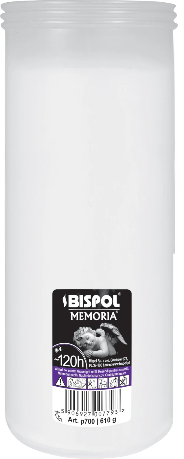 Wkład parafinowy prasowany P700 o czasie palenia do 120 godzin (5 dni) zapewnia równomierne i czyste wypalanie bez kopcenia i smug na szkle. Idealny do dużych zniczy, o wysokości 21 cm i średnicy 8,5 cm, sprawdzi się w każdych warunkach pogodowych. Wkład Memoria to niezawodny wybór na cały rok, gwarantując długi i estetyczny płomień, bez wpływu warunków atmosferycznych.